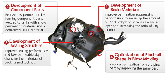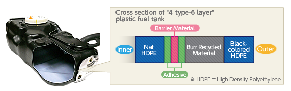 The 4 different materials include a high function resin (Eval) as well as the main material (high density polyethylene). Therefore, permeation of a volatile component of gasoline (HC: hydrocarbon) is suppressed remarkably. Furthermore, the mounting method of tank constituent parts is improved. So, Yachiyo’s plastic fuel tanks comply with the strictest exhaust emission regulations in the world, PZEV.
